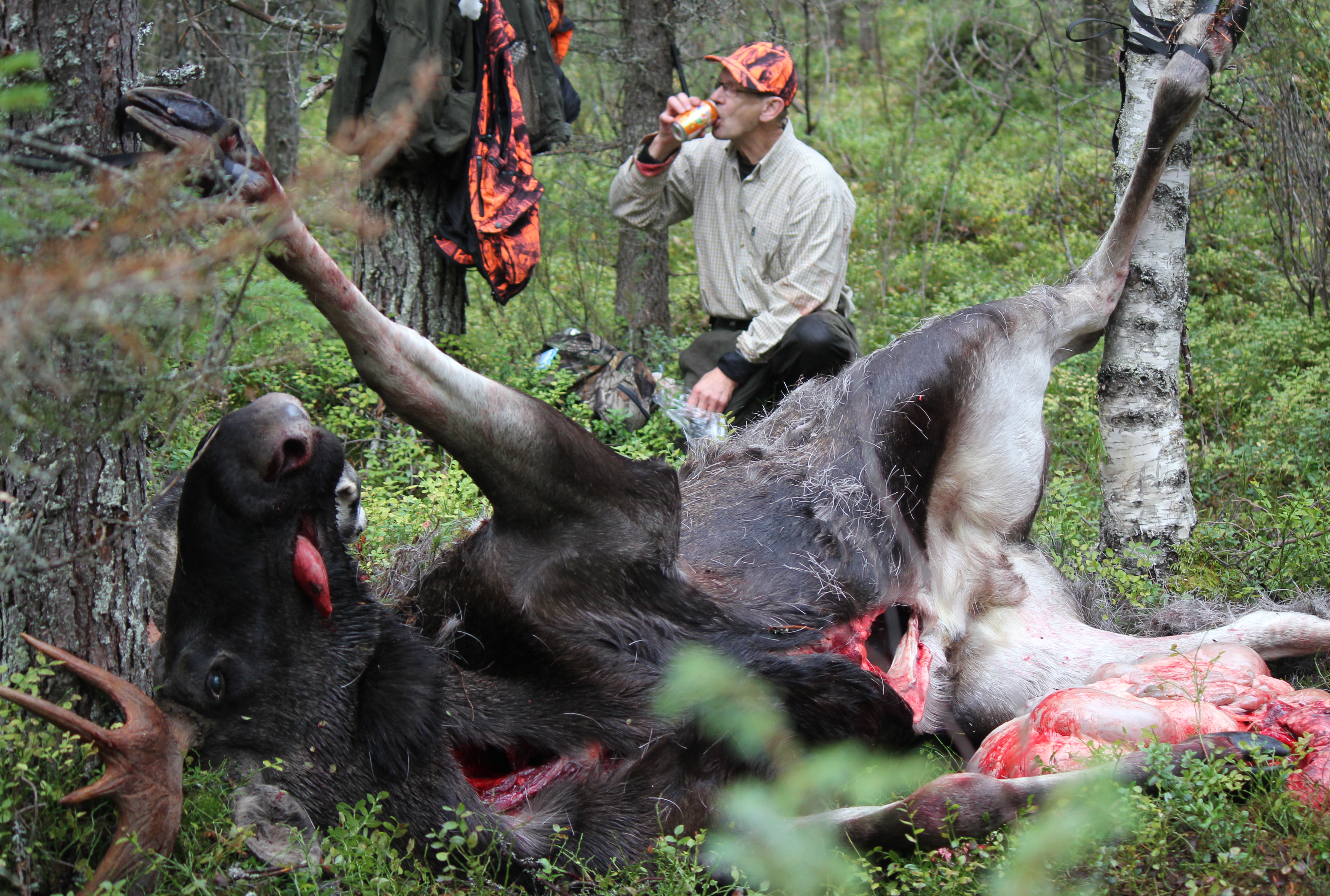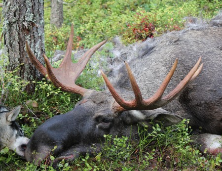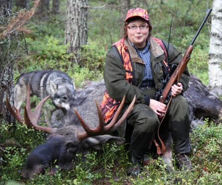 Västra läget samlades i kojan halv sju. Vi var för dagen tre hundförarlag och åtta passare. Margith och jag gick ut från Marjakangas. Vi lämnade bilen vid gamla platsen för jaktkojan. Farkas gjorde fina sökrundor på Marjakangas. Vi stod vid kanten av Ruotimaa när Farkas gav första skallet. Det blev fast stånd på en gång. Nu gällde det att invänta innan vi skulle gå på. Farkas skällde på samma ställe. Jag började lyssnade på skallet och antog att han skällde på två djur. Vi stod 260 meter från ståndet. Vinden låg helt rätt, svag vind från skallet rakt mot oss. När det så var dags att börja smyga var det att röra sig rakt på. Vid hundra meter stannade jag och Margith började smyga på ståndet. Sakta men säker tog sig Margith allt närmare. Väl inom skotthåll såg Margith att det var två vuxna djur som Farkas skällde på. Tät ris gjorde det omöjligt att skjuta. Plötsligt rörde sig djuren 250 meter i motvind. Återigen stod älgarna stilla. Jag följde sakta efter när Margith fortsatte att komma i skottläge. Ståndskallet var mellan gamla Aavakangasvägen och Aavajoki. Jag hade tagit mig ganska nära ståndet och stod snett bakom Margith. Hon såg nu att det var ko och tjur som hunden skällde på. Jag väntade när kommer skottet. Men alla som smugit på stånd vet att det är inte lätt att hitta rent skottfällt. Så small skottet, jag såg tjuren rusa iväg. Jag hörde ett flåsande och förstod att tjuren blåste ut sista luften. Farkas for efter kon i gångstånd. Jag gick mot stället där jag sett tjuren rusa iväg. Jag hittade inte älgen, var fanns tjuren. Tjorven skällde för fullt 250 meter norrut. Jag meddelade Tjorvens husse Karl-Erik att jag går på ståndet och kollar om det är tjuren hon skäller på. Kalle sa att han tror inte att hon byter djur. Väl framme vid ståndet såg jag att Kalle hade rätt. Hon skällde på ko och kalv. Kalle hade kopplat Tjorven och kom för att leta tjuren. Tyvärr for även Tjorven efter kon. Jag bestämde mig för att gå till bilen och hämta Athena för att spåra upp tjuren. När jag var på väg hemifrån meddelade Margith att Farkas hittat tjuren. Han hade kommit tillbaka och sökte upp älgen. Tjuren hade rusat 150 meter. Margith hade fått in ett perfekt skott på en brunstande 10-taggare. Nu var det bara att ta ur och invänta transporten.