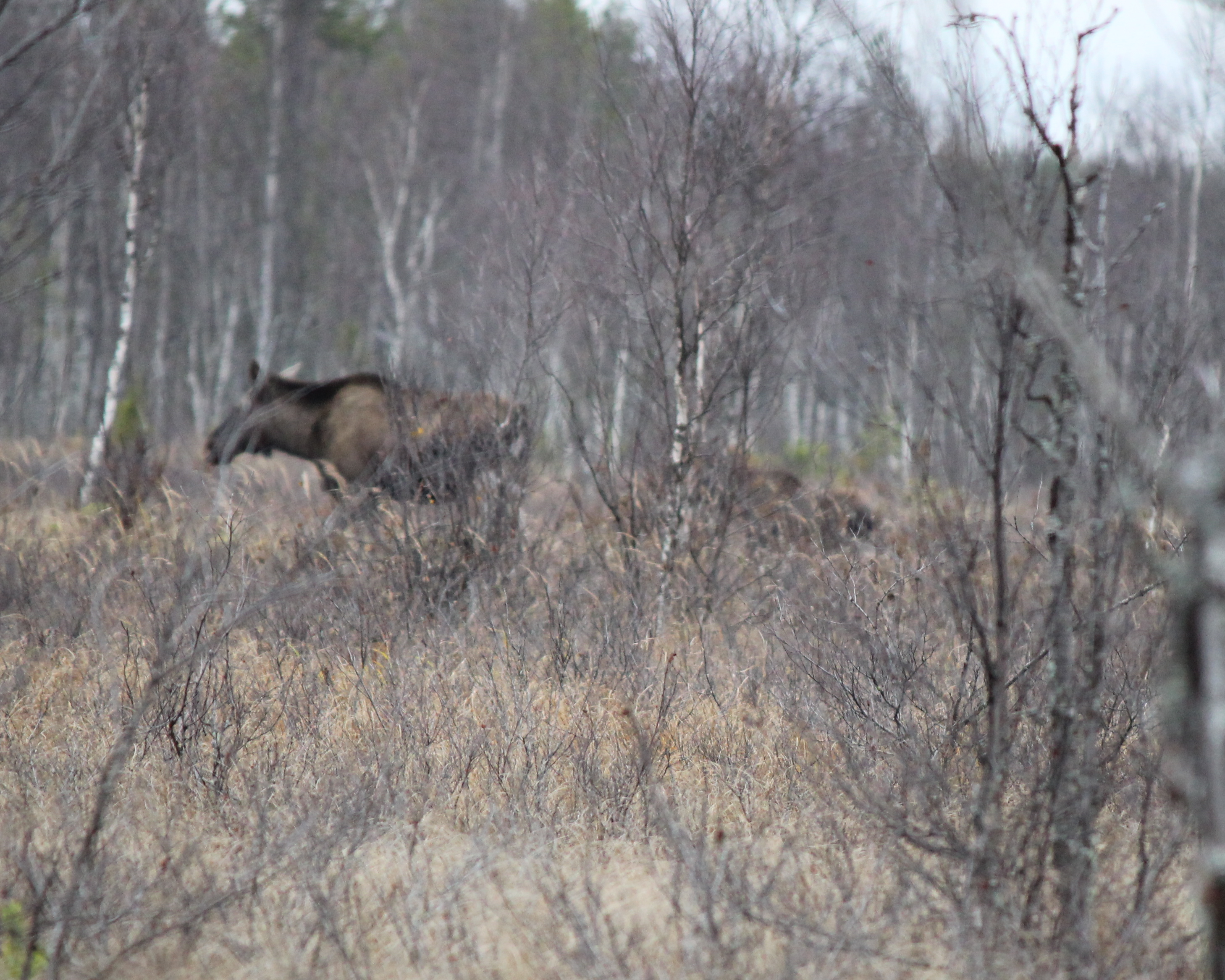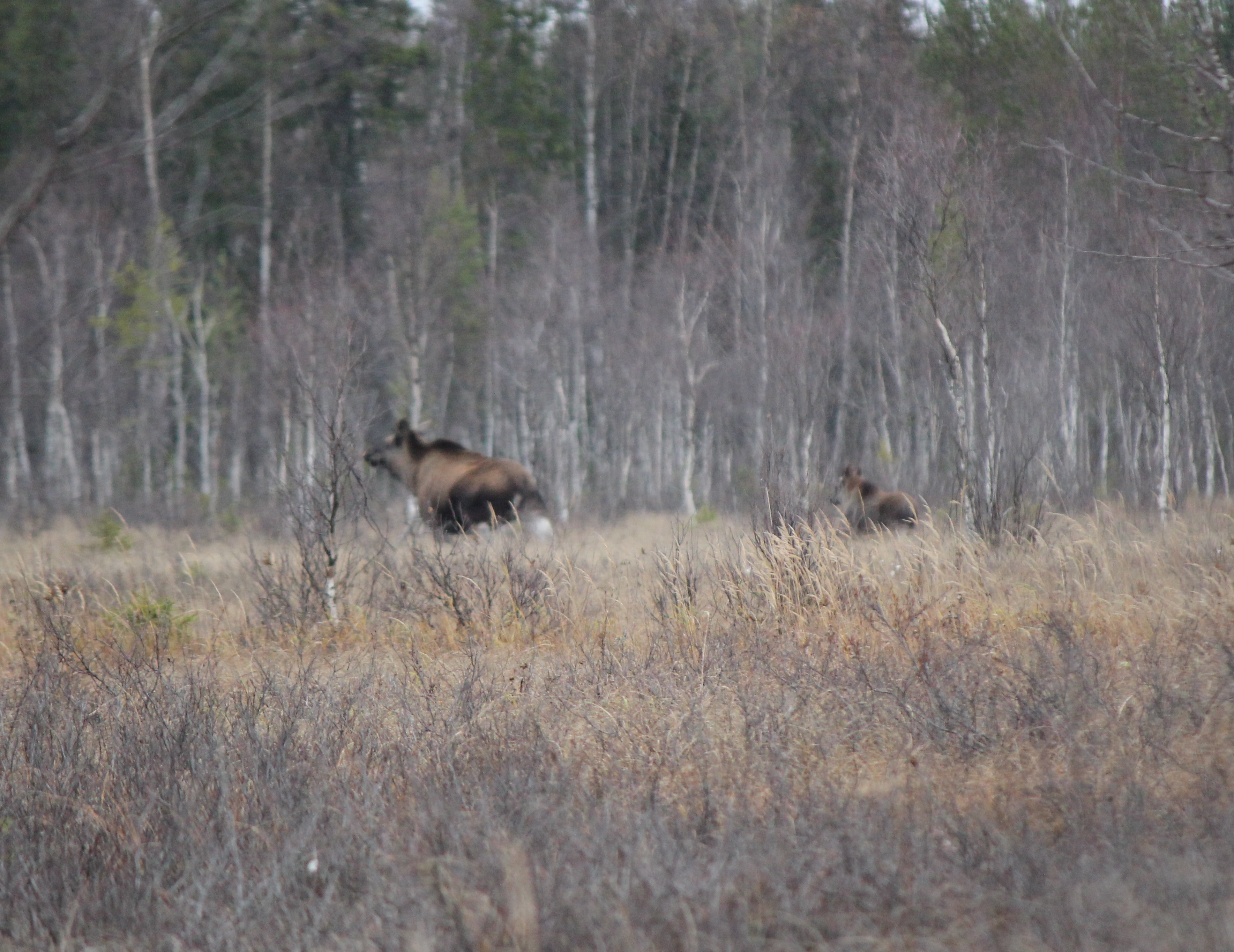 Idag var vi ute med Bessy. Vi släppte henne på Ruotimaa. Det var tomt på älg trots att vi var ända ner mot Aavajoki. Hon hittade en del skogsfåglar som hon stötte iväg utan skallgivning. Vi var tillbaka i bilen efter 1,5 timme. Margith lämnade oss på Pörhönharju. Jag släppte Bessy på norra sidan om vägen. Hon markerade snabbt att det fanns något intressant. Pejlen visade att hon var nästan 300 meter från mig när hon började skälla. Jag förstod att det måste vara älg. Hon skällde mycket fint. När jag var på ca 150 meter hörde jag hur älgen lät vid ståndet. Jag lyckades ta mig på 35 meters avstånd. Bessy hade stånd på ko med kalv. Hon arbetade fint med djuren och skällde i nästan 1 timme på samma ställe. Jag tog några steg och djuren rörde sig sakta norrut. Plötsligt blev det tyst ett par minuter. Bessy var tvungen att ta sig över ett brett dike med mycket vatten. Återigen började hon skälla på älgarna. Jag kom nära ståndet och nu kunde jag se älgarna mycket bättre. Tyvärr var minneskortet fullt så jag kunde inte fortsätta att filma Bessys arbete. Älgarna rörde sig sakta över en myr med mycket vatten. Bessy skällde för fullt. Jag såg när kon och kalven hoppade ner i Hirviojabäcken och ställde sig på andra sidan. Jag rörde mig närmare och kon fick återigen syn på mig. Nu skenade djuren snabbt över myren. Bessy hade då skällt i 1 timme och 20 minuter. Jag trodde att Bessy skulle komma tillbaka. Men hon simmade över bäcken och jag hörde att hon återigen skällde på älgarna ca 500 meter norrut. Jag fick göra en runda för att komma över bäcken vid gamla kvarnplatsen. Älgarna for över en myr som nu efter allt regnande är mera sjölik. Bessy vände om och sökte upp mig. Fint jobbat av 7,5 månad gamla Bessy. Se filmsnutten när Bessy skäller ko och kalv.