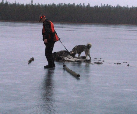 Margith och jag önskar alla Segerlund.net läsare en riktigt God Jul. Vi fick en minnesvärd höst med många fina jaktupplevelser. Jag sätter två bilder på det som kom nog att bli hösten mest minnesvärda händelser. Det är när Margith sköt 10 taggaren för Farkas och när jag sköt kalven för honom. Kalven som gled ut på på isen.